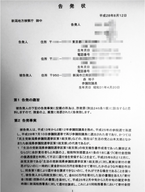 7月の参院選で国政に返り咲いた本県選出の森裕子議員(生活の党県連代表)が窮地に立たされている。同議員が政党支部に寄付をしたかのように見せかけて所得税の還付金を不正に受け取ったとする詐欺容疑で告発され、新潟地検が10月3日付でこれを受理したからだ。今後、起訴されて有罪判決が下るようなことにでもなれば政治生命に関わってくる。告発状を提出したのは東京在住の男性(74)ら2人で、男性はこのたび本誌に告発に至った経緯について寄稿してくれた。以下、全文を掲載する。