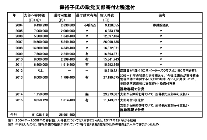 ところが、その年の7月の参院選挙に落選するや、9月から「支部」寄付を再開したのである。結局、森氏は、2013年に600万円、2015年に605万円を支部に寄付し、いずれも還付金を受け取ったのである。