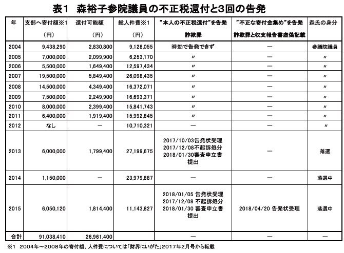 森氏を巡っては、13〜15年にも不正に総額260万円〜360万円の所得税還付を受けたとして男性から告発を受け、不起訴の後不服審査を1月に新潟検察審査会が受理している。〉(毎日新聞2018年4月25日付)