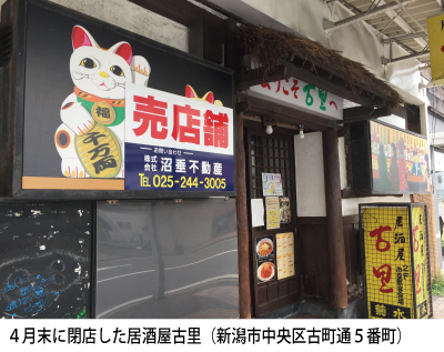4月末をもって閉店した古町通5番町の居酒屋古里もそんな店のひとつ。当初は〈休業〉の貼り紙がされていたが、現在は空き店舗となって売りに出されている。