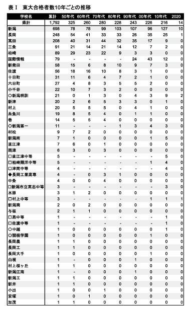 なりにエリートでした。村松、中条、水原といった高校は今や完全に没落しましたが、その当時は地元のエリートが行く学校なので、満遍なく東大合格者が出たわけです。なお、大学入試の対応は学校が主導するものではなく、個人の責任でした。大学入試データの情報化などもない時代でした」(校長経験者)
