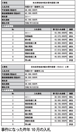 事件となった入札は昨年10月に実施された2件(別掲)。いずれも9社が参加した一般競争入札で、どちらもカトーが最低制限価格を1万円上回る金額で落札している。当時、水道局の主査だった市職員が、業者の営業担当だった社員に2件の設計価格が記録されたUSBメモリーを手渡し、この情報を基に応札したカトーが工事を落札したのだという。