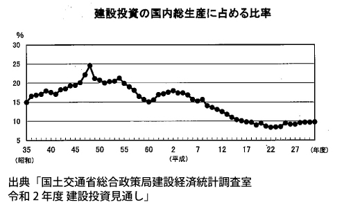 表をご覧頂きたい。建設投資の国内総生産に占める比率は昭和48年の24・6%をピークに下落し、平成22年には8・4%まで下がった。令和元年には9・8%と若干戻したものの、ピーク時の4割に過ぎない。