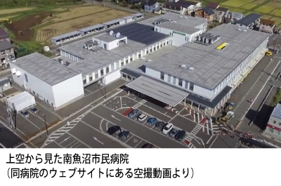 写真は南魚沼市民病院のウェブサイトにある空撮動画のスクリーンショットだ。写真中央の下側で、右側の建物に接して張り出した長方形の屋根が見える。これが正面玄関のキャノピーだ。