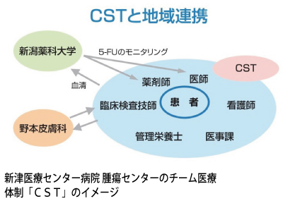 「(CSTの構成は)化学療法のレジメン(化学療法における抗がん剤の投与方法、治療計画)を決定し患者の治療方針にかかわる医師、患者および家族のニーズを拾い上げる看護部、薬剤指導を担当する薬剤部、化学療法の血液検査および5-FU(抗がん剤、5- フルオロウラシル)の血清濃度検体の保管を担当する検査科、化学療法時の食事指導をする栄養科、化学療法開始前に医療費の説明および補助制度について患者と家族に説明する医事課、5- FUの血清濃度を測定する新潟薬科大学」 (同)