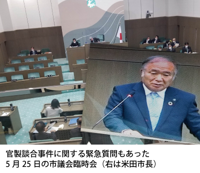 6月14日から始まった市議会の定例会でも、当然ながら多くの市議が官製談合事件を取り上げている。5月25日の全員協議会でのこと、官製談合事件に関する市議の発言に対し。米田徹市長が気色ばみ、一瞬ざわつく一コマがあった。