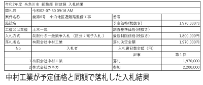 5月、糸魚川市では官製談合事件が発覚。同市が発注する工事の入札では、予定価格に近い、すなわち契約可能な上限付近での落札が目立った。事件となった入札も、逮捕、起訴された市職員が伝えたという金額に基づき、業者は予定価格付近、すなわち上限ギリギリで落札していた。