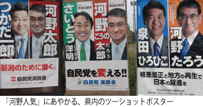 別掲したのは県内の自民党衆院議員らによる河野太郎行政改革担当相とのツーショットポスターだ。同相は自民党でも麻生派に所属している。県内の選挙区では1区から出馬を予定する塚田一郎前参院議員、前回3区で50票差に泣き、比例で復活した斎藤洋明衆院議員が麻生派。