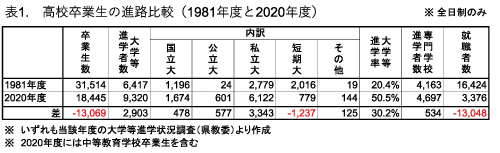 確定数値はまだ公表されていないが、本県の2021年3月高校・中等教育学校卒業生の大学短大等進学率(以下、大学進学率)は50%近くになりそうだ。20%だった40年前と比較すると隔世の感を覚える。その他にも短大進学者や就職者が大きく減るなど、本県高校生の進路は様変わりした。
