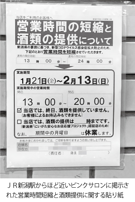 新潟駅前で営業するこうした複数のピンサロが1月21日に始まった営業時間短縮要請を受けて、一斉に時短営業に入った。
