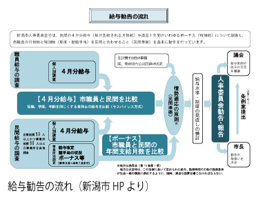 新潟市の場合、人事委員会が市職員給与と期末勤勉手当、市内の民間事業所の給与とボーナスを調査する。役職、学歴、年齢が同じ者同士の水準を比較。差が開いていれば民間に近付ける。その結果として、たとえば「月額給与は増減なし、期末勤勉手当(ボーナス)は0・1ヵ月分下げる」などと市長と議会に報告・勧告。その通りにすると市長が決めたなら、給与改正の条例案を議会に提出し、議会が可決して決まる。