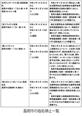 別掲の一覧表を見ていただきたい。長岡市の指名停止業者を示したものだ。表にある上の2社は同市の清掃業務に関する件で指名停止となった。指名停止3カ月とある「太平ビルサービス(株)長岡営業所」が処分された理由は以下のよう。〈令和3年5月