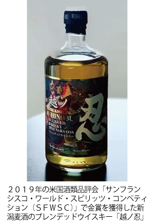 また新潟市西蒲区越前浜で地ビールを製造する新潟麦酒は2017年にウイスキー製造を開始。自社で蒸留した原酒と本場スコットランドで熟成した原酒を混ぜ、ミズナラの樽で寝かせたブレンデッドウイスキー「越ノ忍」は2019年3月の米国酒類品評会「サンフランシスコ・ワールド・スピリッツ・コンペティション(SFWSC)」で最高賞に次ぐ金賞を獲得した。