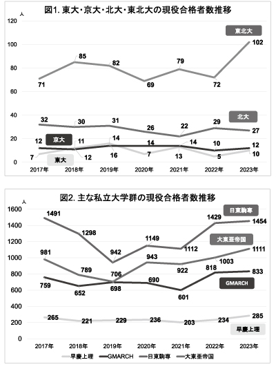 図1のグラフをご覧いただきたい。東京大、京都大、北海道大、東北大の現役合格者数の推移である。この4大学は国立最難関大学群である「旧7帝大」の中でも、本県からの合格者数が比較的多い大学である。