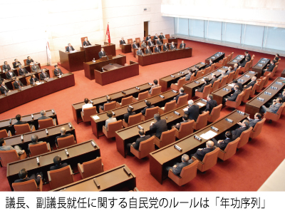 知られているように、自民党県連にと言うべきか、議会で過半数を占める同党の県議団にと言うべきか、本県の自民党には長年にわたり、県議会議長、副議長の選出に関するルールがある。「議長、副議長の就任は当選回数順、当選回数が同じなら年齢順」というもの。