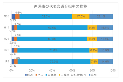 現在、新潟駅周辺整備事業、越後線・上所駅整備事業、にいがた2㎞シェアサイクルなど、車以外の利用促進、利便性向上に関する事業が進められている。区バスや郊外の路線バスへの支援も継続している。