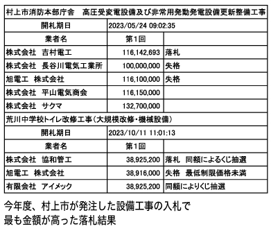 やや細かいが別表を見ていただきたい。今年度、村上市が発注した工事案件で電気設備、機械設備などの、いわゆる設備工事の入札で、最も落札金額が高かった入札の結果を示したもの。