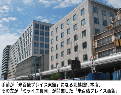 昨年7月22日、JR長岡駅前の大手通りに面した一画に、「米百票プレイス ミライエ長岡」が華々しくオープンした。旧北越銀行本店や旧大和、長岡商工会議所などがあった「大手通坂之上町地区」では、市街地の再開発事業が行われている。この再開発事業で建設された「米百俵プレイス西館」に、長岡市が整備した「人づくり・学び・交流エリア」が「ミライエ」だ。その名称は市内外から