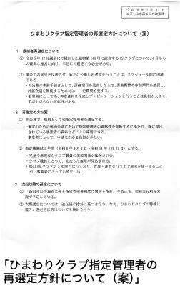 指定議案の一部が取り下げられたのだから、ひまわりクラブの指定管理について、取り下げ分については「再選定」を行わなければならない。その「再選定」の方針を示したものが、「ひまわりクラブ指定管理者の再選定方針について(案)」なる文書だ。…続きは本誌で
