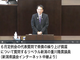 こうした方針が示された中、3月5日に県議会総務文教委員会では、リベラル新潟の重川隆廣議員(新潟市西蒲区選出)が県当局に以下のように質問した。「県債基金、県債管理基金、公債費調整分の令和5年度末残高は406億円と県は見込んでいます。令和6年度当初予算で活用予定の23億円を除いた 383億円をすべて活用し、令和6年度に繰り上げ償還を行った場合に、令和6年から令和18年までの削減額の総額はいくらになるのか伺います」 (重川議員)