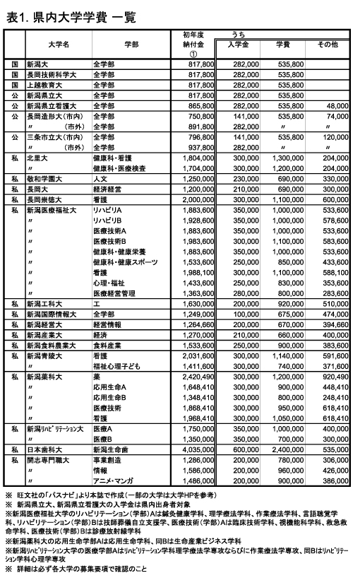 本稿では主に県内大学の学費をまとめた上で、学生の生活費や奨学金受給割合などの平均額を考察し、さらに民間や大学が行っている給付型の奨学金を紹介していく。