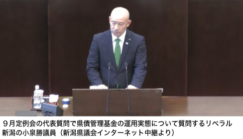 小泉議員は本県の運用実態について「新潟県公金管理方針によれば、安全性および有利性の確保を図ることを前提とした上で、 可能な限り有利な管理を行うとしていますが、他の団体に比べ大きく劣っているこの不十分な運用は、 県民の利益に反しています」と前置きした上で、具体的な数字を挙げて以下のように続けた。