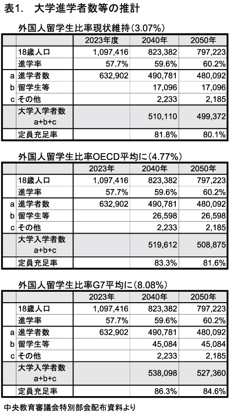 これによると(表1)、2040年の国内の大学進学率を60%とした条件で、留学生比率が現状のまま(3・1%)だとすると、同年の大学入学者