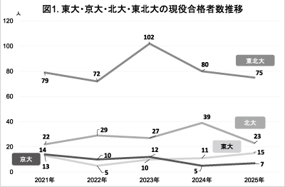 図1にはその東大と京都大、北海道大、東北大の現役合格者数の推移をグラフで表した。近年の合格者数は、東大と京大がそれぞれ15名程度で頭打ち、北大と東北大を合計して120名程度で頭打ちという印象だ。