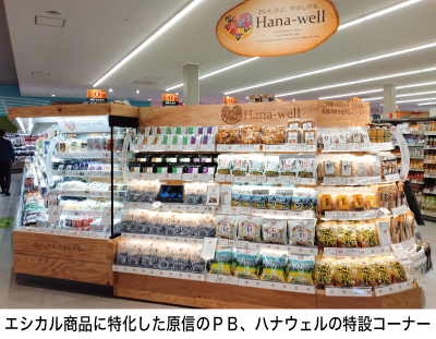 ハナウェルの評価は消費者を中心に高まっている。PBといえば問屋を経ていない分、割安な商品というイメージが先立つが、ハナウェルの商品群は決して廉価なわけではない。では、なぜ評価されるのか。ハナウェルがエシカル対応だからだ。エシカルは「倫理的な」という意味だが、食品スーパー業界では、人や社会、地域、環境などにやさしい商品を指す。つまり、健康に良くて、社会や地域、環境にも貢献している商品のことだ。同社はハナウェルの商品開発を続け、2年経った今では164品目まで増えたという。消費者はハナウェル商品を購入することによって、自然にこれらの課題に貢献することになる。そのハナウェルについて原社長に伺った。