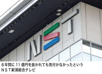 フジテレビ系列のNST新潟総合テレビ(新潟市中央区)が約11億円もの所得隠しにおよんでいたことが関東信越国税局の税務調査によって発覚した。会社側は「NSTから制作会社に支払った費用のほとんどが弊社元社員の親族名義の会社に流れていた」とし、自社への還流を強く否定しているが、一方では経営トップによる「利益至上主義」の強権統治が元社員を不正に駆り立てた可能性も取り沙汰されている。