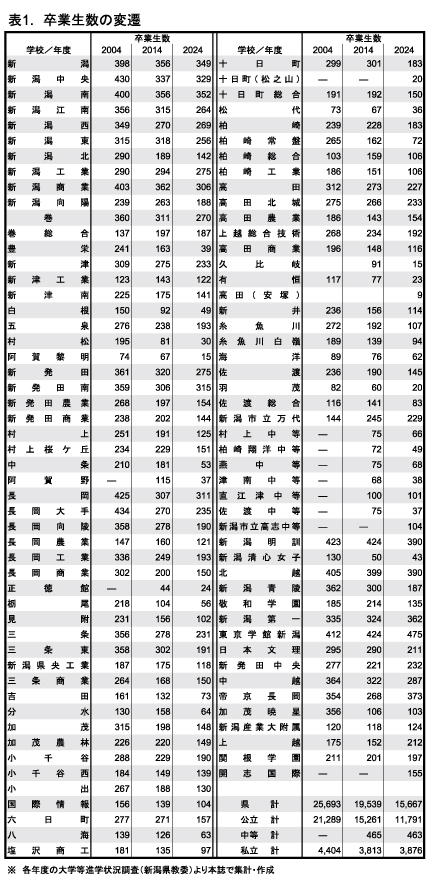 公立高校(県立・新潟市立)卒業生数は、04年度2万1289人に対し24年度1万1791人と約9500人減。この間に公立中等教育学校ができ、24年度は463人が卒業した。私立高校は04年度4044人が卒業、24年度は3876人で約500人減った。