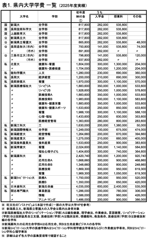そこで、新潟県内限定ではあるが、入学金、授業料、諸経費、これらを足した初年度納付金を大学ごとにまとめてみた(表1)。予めお断りするが、大学の学費や後段で紹介する奨学金などについては、主に過年度の情報を参考にしているので、最新情報を必ず各自で確認していただきたい。