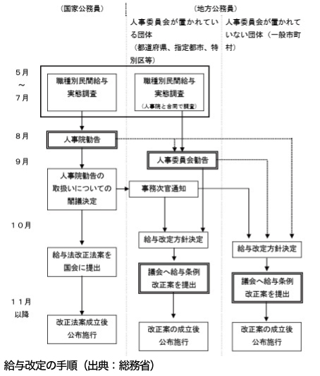 これを受け、人事委員会は「民間との差を埋めるための給料表の引き上げ」と「ボーナス(期末勤勉手当)の0・05ヵ月分引き上げ(計4・65ヵ月)」を勧告。その結果、勧告後の県職員(平均43・8歳)の平均年収は、前年より18万3000円増の651万1000円となる見込み。新潟市においても同様の傾向が見られ、民間との1万円以上の差を埋めるべく、年収ベースで約20万円の増額が示された。