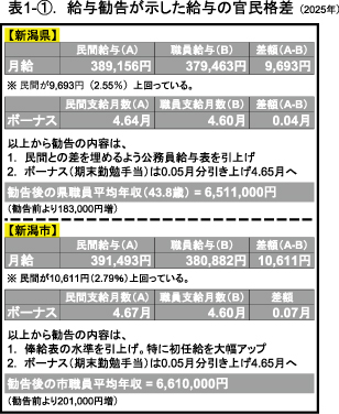 公務員の給与決定プロセスは図(給与改定の手順)のとおり。まずは「職種別民間給与実態調査」によって民間の動向を把握することから始まる。調査の結果、令和7年は、新潟県では民間給与が職員給与を月額にして9693円(2・55%)上回っているというデータが示された(表1―①)。