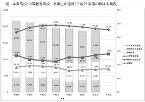 先ごろ、県教委が大学等進学率の速報値を明らかにした。それによると、本県は4年連続で下落したという。平成21年度の49・0%を頭打ちに毎年少しずつ下落。この春卒業した高校生・中等教育学校生の同進学率は45・7%だったという。