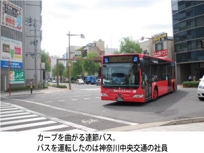 さて、記者が市役所本館に着いて目にしたのは、長く大きな赤いバス。この連節バスは、市が神奈川中央交通から借り受けたもの。