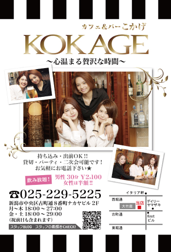 当然ながら新潟にもこの形態の店が複数あるが、そんな中でもひときわ高い人気を誇っているのが今回紹介する古町通8番町のカフェ&バー こかげだ。