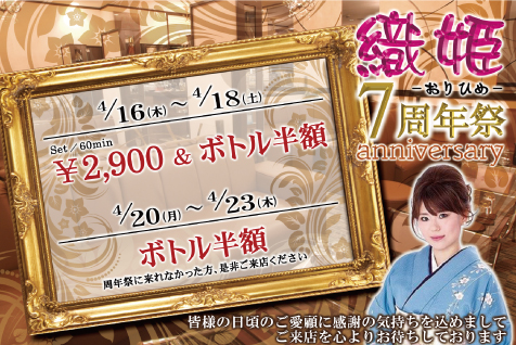 さらに7周年祭で4月16日~18日の3日間はフリーセット2,900円(60分)、20日~23日はボトル半額で提供。
