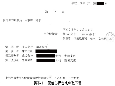 下越地区に本社を置くN社のO社長はこう言った。同社は昭和63年創業で、繊維関連で培ったオリジナルの技術を応用し、各種の分野へ進出している。現在、その経営は順調だ。まずO社長が示したのは仮差し押さえに対する取下書だった(資料1)。