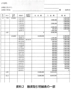 税金の滞納でもあるまいに、なぜ銀行の通帳に仮差し押さえが入るのかが解せない。それはともかく、資料2は2千万円のビジネスローンに関する「融資取引明細表」の一部だ。作成日は昨年12月9日。この明細書で示されているのは平成17年1月以降の内容だけで、それ以前のものはデータの保存期限を超えていたためか示されなかったという。
