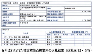 まず入札結果を見ていただきたい。三条市の発注で、今年6月15日に開札されたもの。紙に金額を書く方式ではなく、インターネットを使って実施する電子入札の結果だ。
