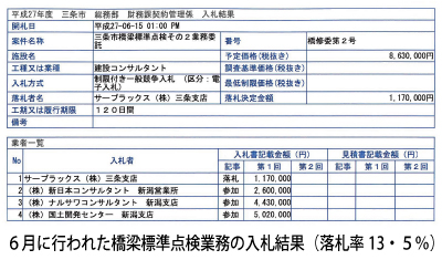 隣の燕市でも似たような案件が8月に発注されている。跨線橋の橋梁定期点検で、13業者による指名競争入札の予定価格は211万円。落札金額は206万円で、落札率は97・6%だった。