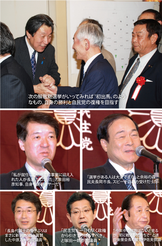 この日は支持者ばかりでなくゲストも多士済々。塚田一郎、中原八一両参院議員、昨年4期目を無投票再選となった森民夫長岡市長、今年度に改選を迎える泉田裕彦知事も顔を見せた。