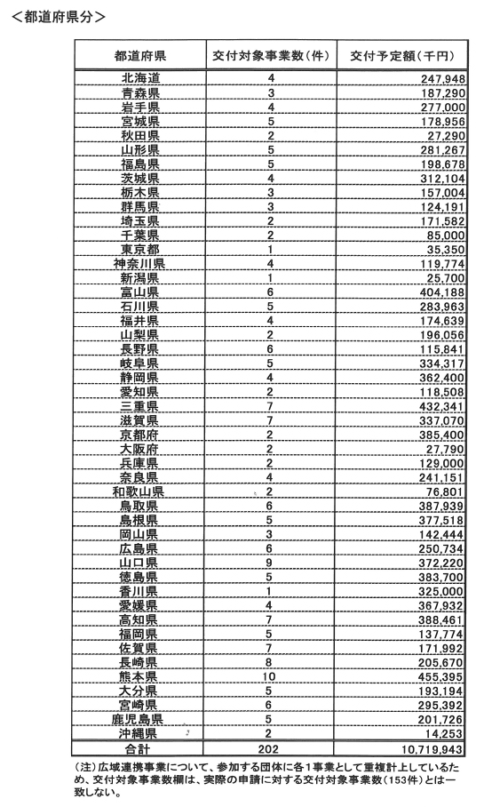 ずいぶんとおっとりした答弁だ。実はこの資料を見て愕然とした県議が少なからずいる。大渕県議もその一人だったのだろう。表をよく見ていただきたい。本県分(県内市町村分は除く)は同県議が指摘した件数、交付予定額のとおりだ。他県の状況を見比べていただきたい。よく見ると本県より下は沖縄県の1千425万3千円だけ。即ち新潟はビリから2番目だ。
