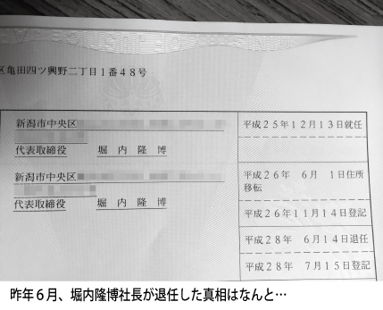 株式会社だるまやの登記簿謄本を見ると、堀内氏は昨年6月14日付で社長を退任したことが記されている。
