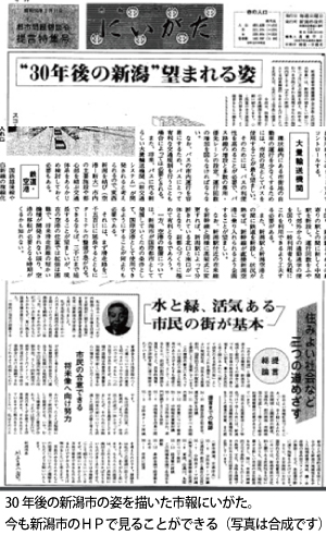 号外のテーマは「都市問題懇談会提言特集号」。「“30年後の新潟”望まれる姿」の大見出しが一面を飾る。新潟市の教育・文化、産業、都市づくり、交通について、新潟市の望ましい将来像を描いたものだった。