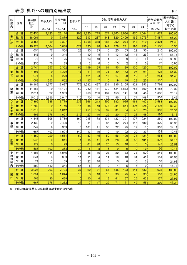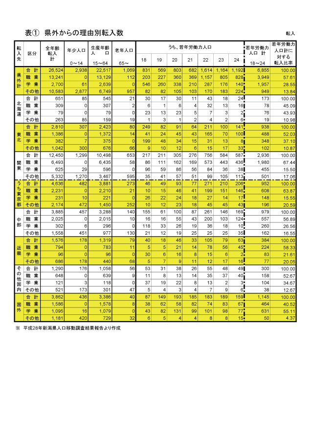 改めて別表②の転出数をご覧いただきたい。若年労働力人口の転出数は1万1,479人。うち「職業」を理由とする者は7487人で65%を占めた。進学以上に就職時に新潟を離れる者が圧倒的に多いわけだ。