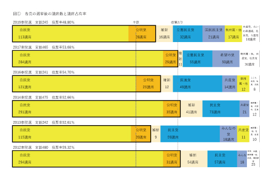 非改選分を含め、定数245のうち自公で131議席は過半数突破。維新や国民民主党など改憲に前向きな政党を含めると、3分の2以上にもなる。これ以前の国政選挙、直近5回を見ても、自公が安定して勝っている(図①)。