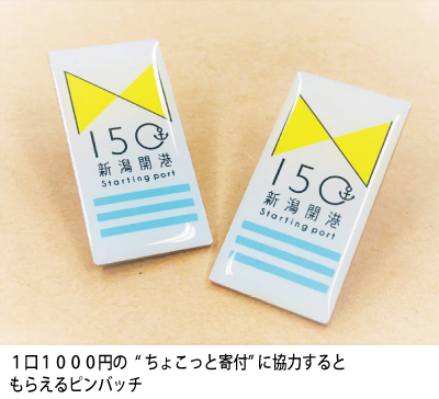 こうしたことから行政だけが資金を負担するのではなく、市民のみなさんにも参加意識を持っていいただきたいと考え、“ちょこっと寄付”を実施することになりました」(新潟開港150周年記念事業実行委員会)