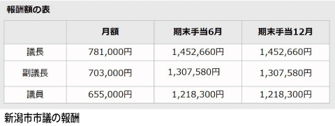 新潟市議の月額報酬は65万5千円。このほか121万8千300円の期末手当が年2回、6月と12月に支給される。これらを合計すると年収は1千万円超。さらに報酬とは別に政務活動費が月額15万円(会派交付分と議員交付分を合算した額)支給される。これだけでも年間180万円になる。